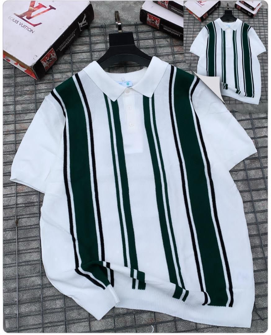 This stylish polo short sleeve shirt offers a classic and sporty design with a modern twist. It features a bold striped pattern and is made with a breathable, open-weave mesh knit fabric. The shirt has a full-button front and a crisp polo collar, creating a refined yet casual look. This lightweight and comfortable piece is perfect for a smart-casual outfit, making it a great addition to any wardrobe for warmer weather.
